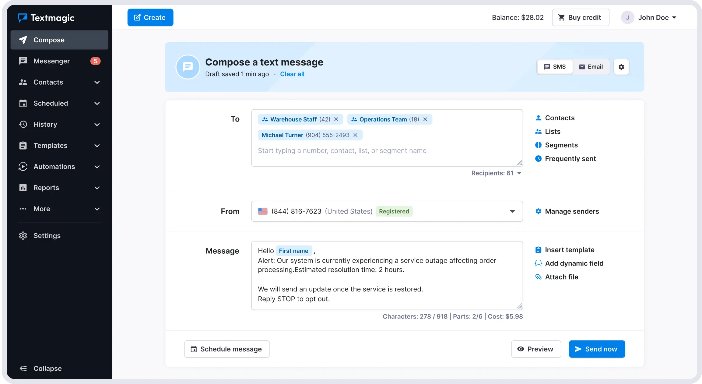 - Schedule one-time or recurring texts