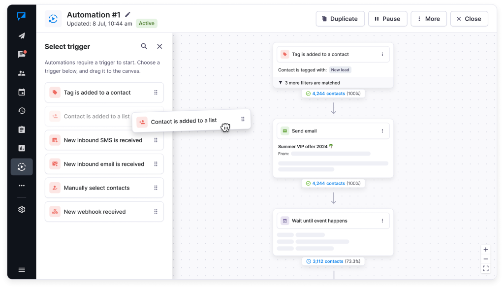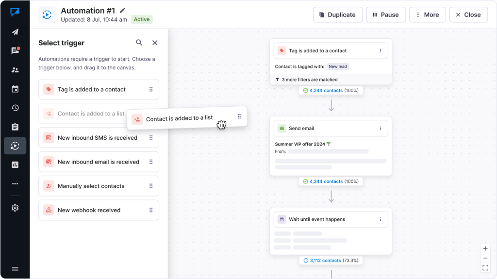 Create message flows that work on their own. Design and manage everything visually with a simple drag-and-drop builder.