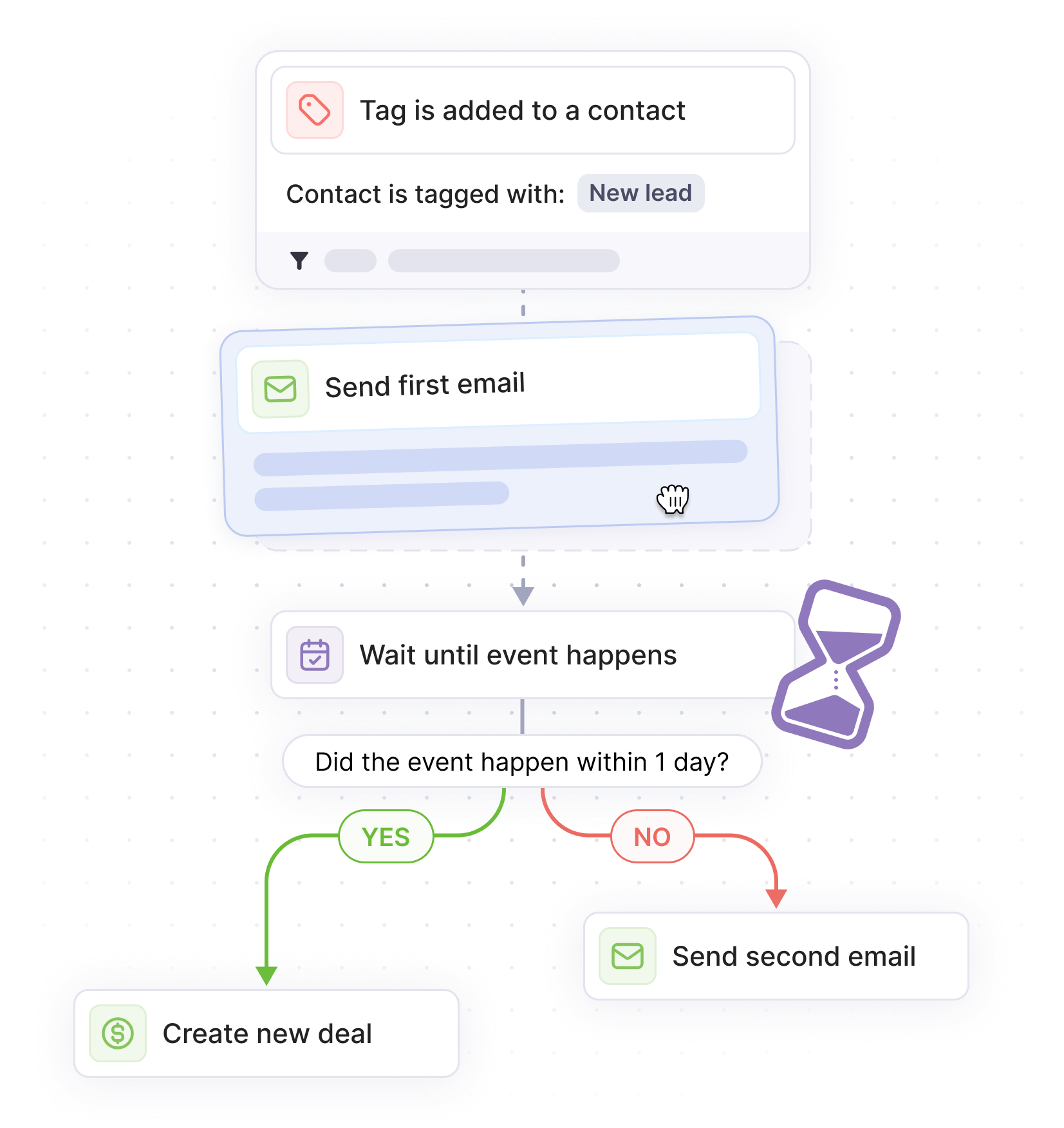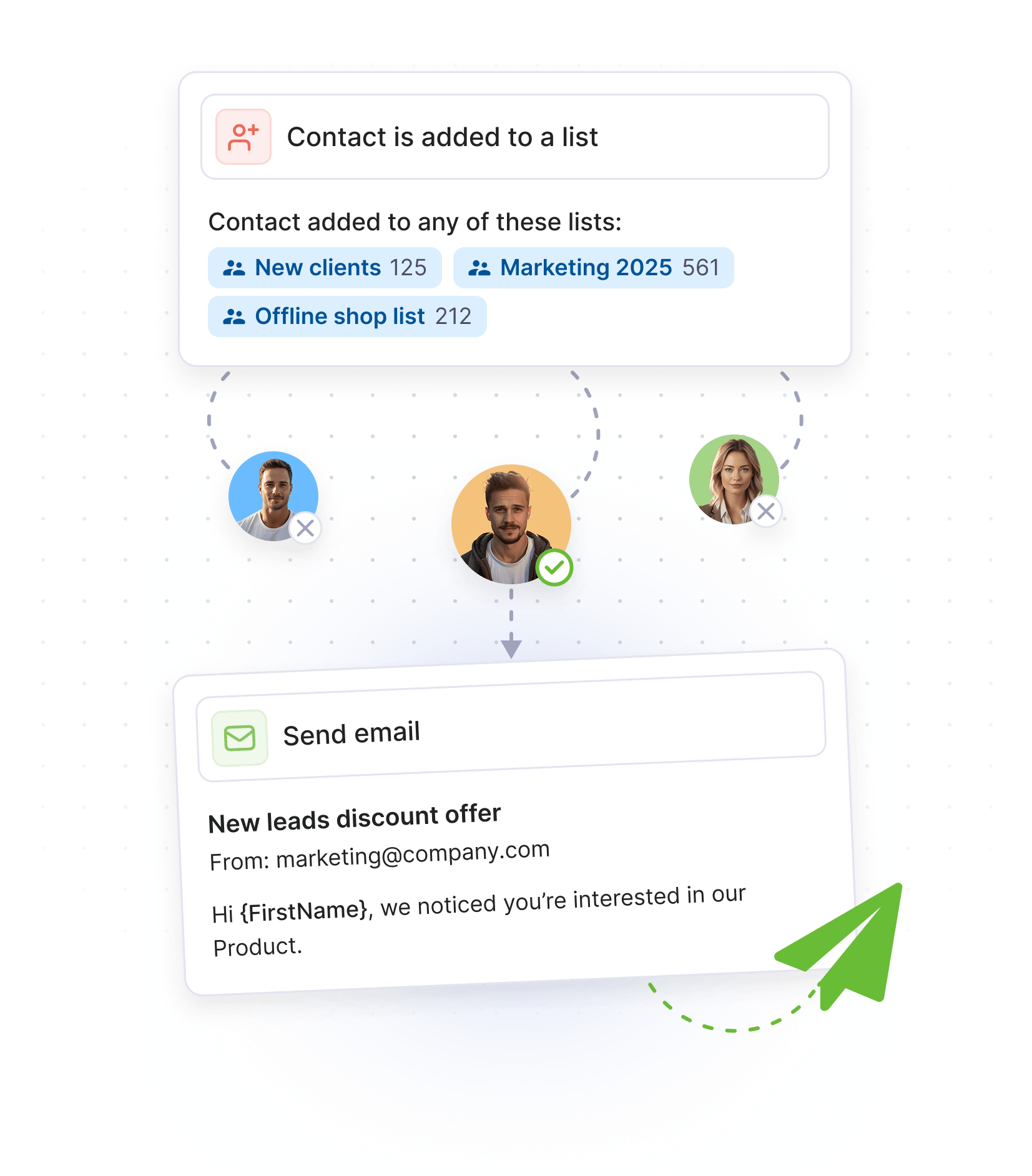 Send messages that feel relevant to each contact. Automation reacts to behavior in real time – from first visit to purchase.