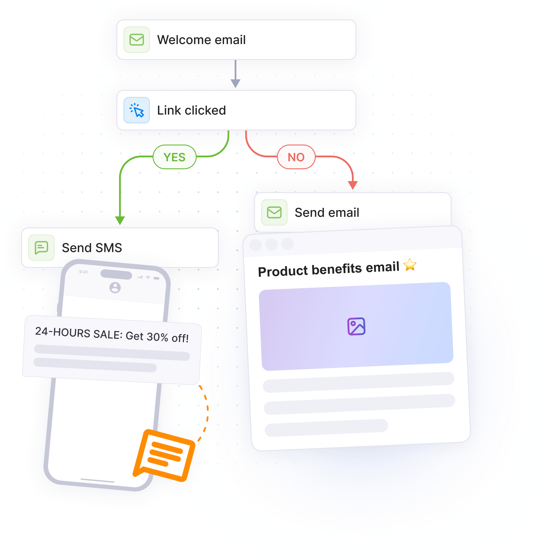 Combine SMS and email into one flow. Send the right message through the right channel – without switching tools.
