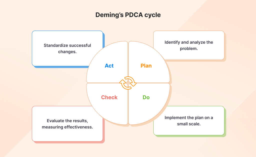 Starting from Shewhart’s cycle for continuous learning and improvement, Deming published his Plan-Do-Study-Act (PDSA) cycle in 1993. His framework evolved into what we know today as the PDCA cycle.
