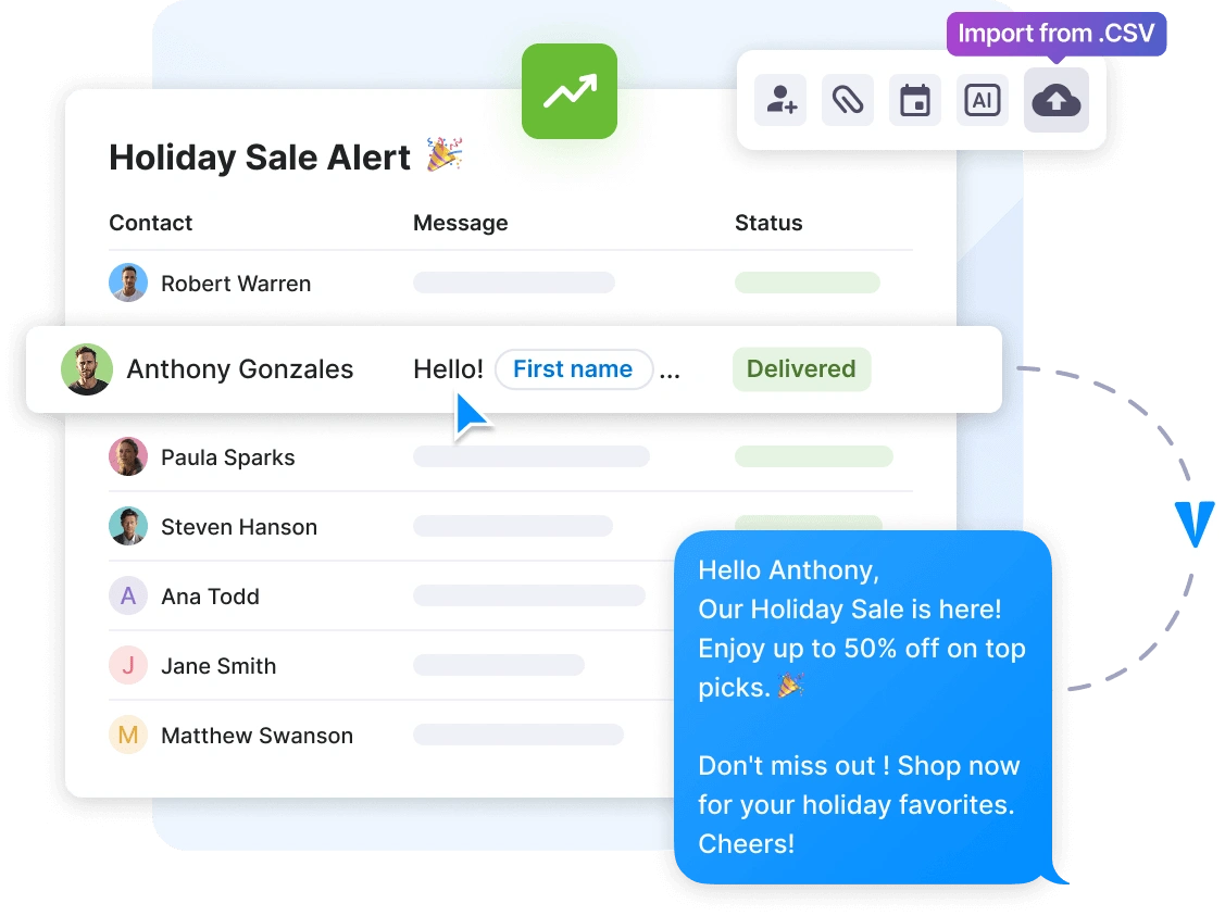 With bulk SMS, you can schedule campaigns, track delivery and responses, and stay compliant with texting regulations. It’s the fastest, most reliable way to keep your audience informed and engaged, whether you're reaching hundreds or thousands.