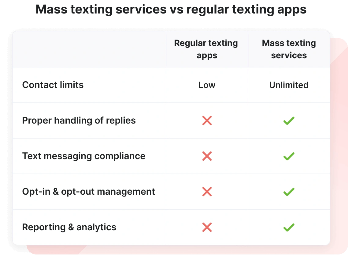 A mass texting service is essential when you need to send text messages to multiple people at once. Unlike regular texting apps, it’s built for scale, making it ideal for urgent updates, limited-time promotions, appointment reminders, and customer alerts.
